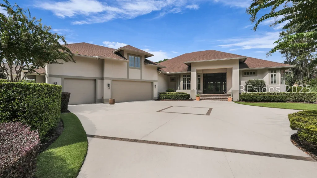 This stunning modern-transitional home is perfectly situated on a prime water and golf view homesite, offering elegance, comfort, and exceptional upgrades throughout. The heart of the home is the grand great room, highlighted by soaring tray ceilings and a custom-designed movie theater focus wall with a lighted mantle and built-in surround sound speakers. Just beyond, the screened lanai invites you to relax with its crystal-blue dipping pool, spa, cascading water feature, and fully equipped outdoor kitchen creating a true Lowcountry oasis.The chefs kitchen combines style and function with a Fulgor Murino induction cooktop, Thermador appliances, a spacious island, and an adjacent breakfast nook overlooking the lagoon. A formal dining room provides an elegant setting for entertaining. The home also includes a large office with custom removable bookshelves and wide windows that capture the morning sun and tranquil lagoon views.The owners suite is a spa-like retreat featuring a walk-in shower, dressing table, bidet, and abundant natural light. Two generous guest suites are located on the first floor, while a bonus room over the garage provides flexibility for a fourth bedroom or media space. A dedicated media closet with in-wall cabling is already in place to support a state-of-the-art home theater.Additional details include plantation shutters throughout, a wet bar with in-cabinet wine racks, and a spacious two-car plus golf cart garage with epoxy flooring, cabinetry, sink, and a Gladiator track system for bikes and gear.3M film on all windows applied 2003 for UV and hurricane protection. The home also offers easy walk-in attic access, spray-foam insulation for efficiency, and beautifully maintained landscaping that enhances its curb appeal.Every detail has been thoughtfully designed, from upgraded fixtures and stunning wood floors to the seamless blend of classic elegance and modern luxury.2024 property taxes for resident were $6750. (Virtual enhancement has been used in some photographs)